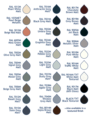 The standard aluminium RAL colour range includes 29 colours to choose from. The standard range of colours are produced with a 30% gloss unless otherwise stated.